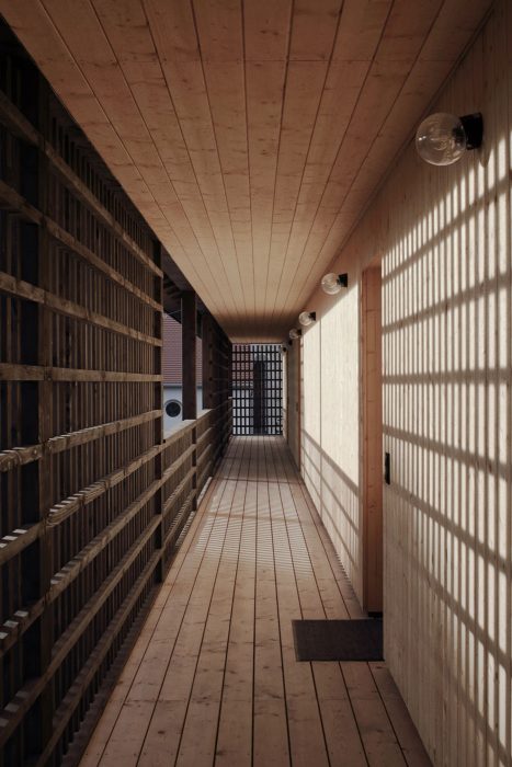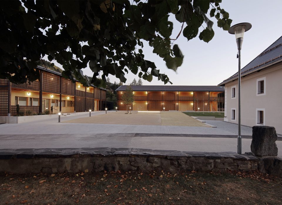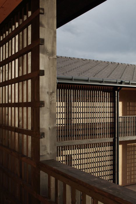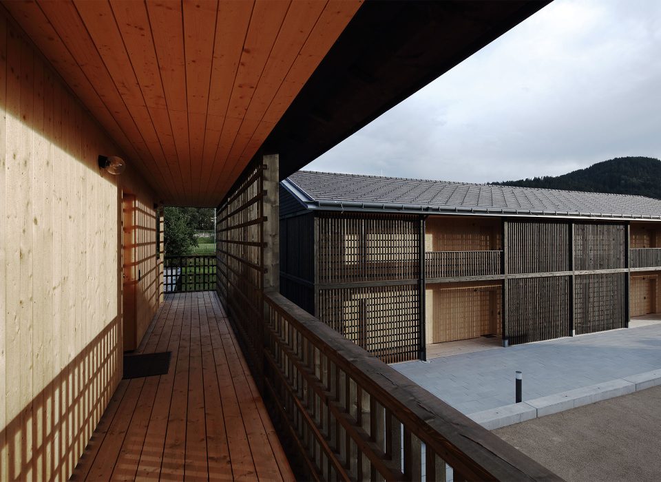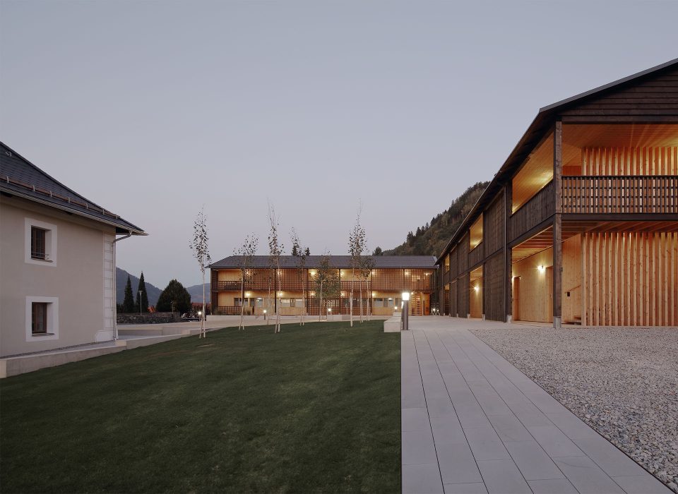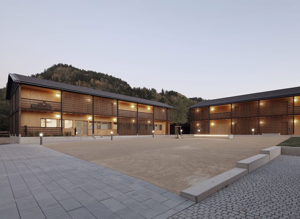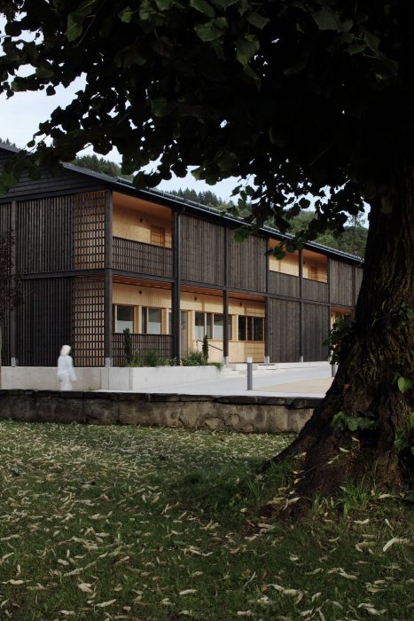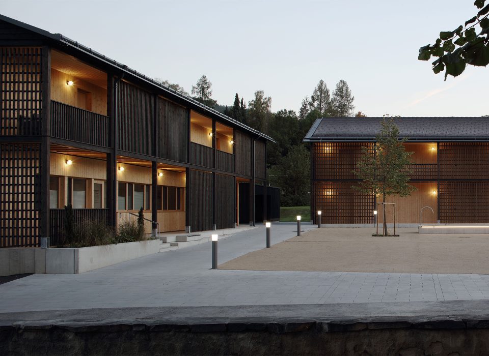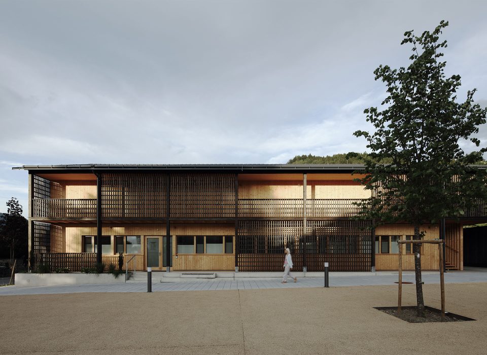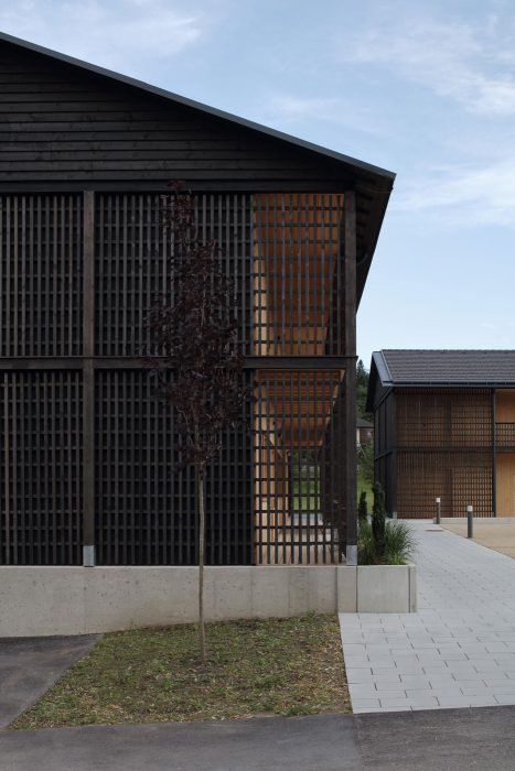 Die Architektursprache und die Materialien sind klar und einfach. Die sichtbar gemachten Holzstrukturen der Fassaden entsprechen dem materialkonformen Konstruktionsraster, welcher an die Jahrhunderte alte Bautradition der waldreichen Region anschließt.