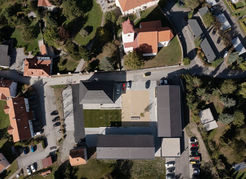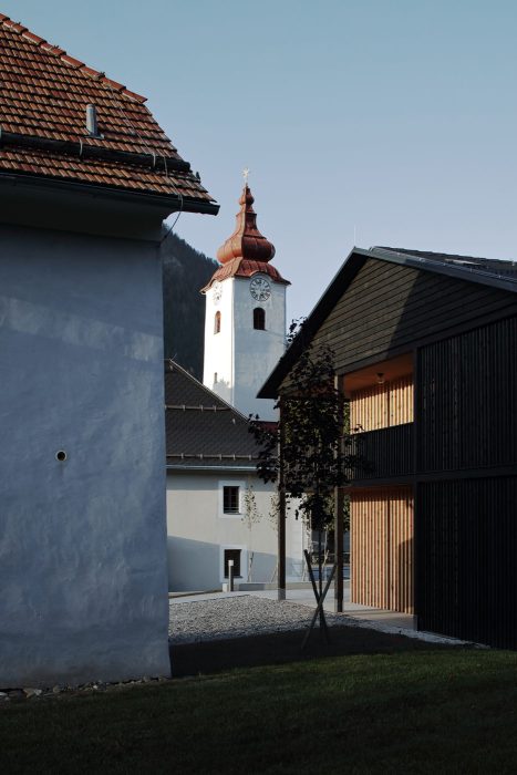 Im gegebenen Fall bestand die Möglichkeit im Bereich der Kirche und des Pfarrhofes, durch das Zufügen weiterer Baukörper einen Pfarrplatz zu bilden. Eine Praxis und ein zentrumsnaher Wohnbau – adaptierbar für betreutes Wohnen – entstehen in zeitgemäßer Qualität. Eine funktionelle Verdichtung und Belebung wird somit generiert. Die beiden neuen Baukörper bilden einen ruhigen, nahezu orthogonalen Ortsraum mit hoher Aufenthaltsqualität.
