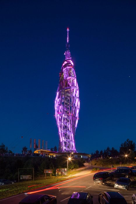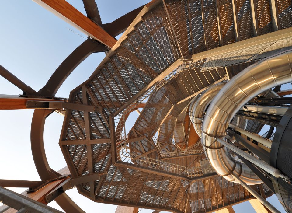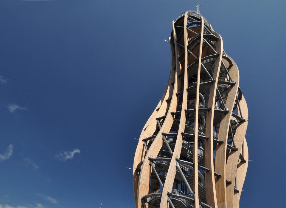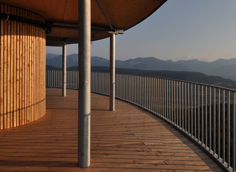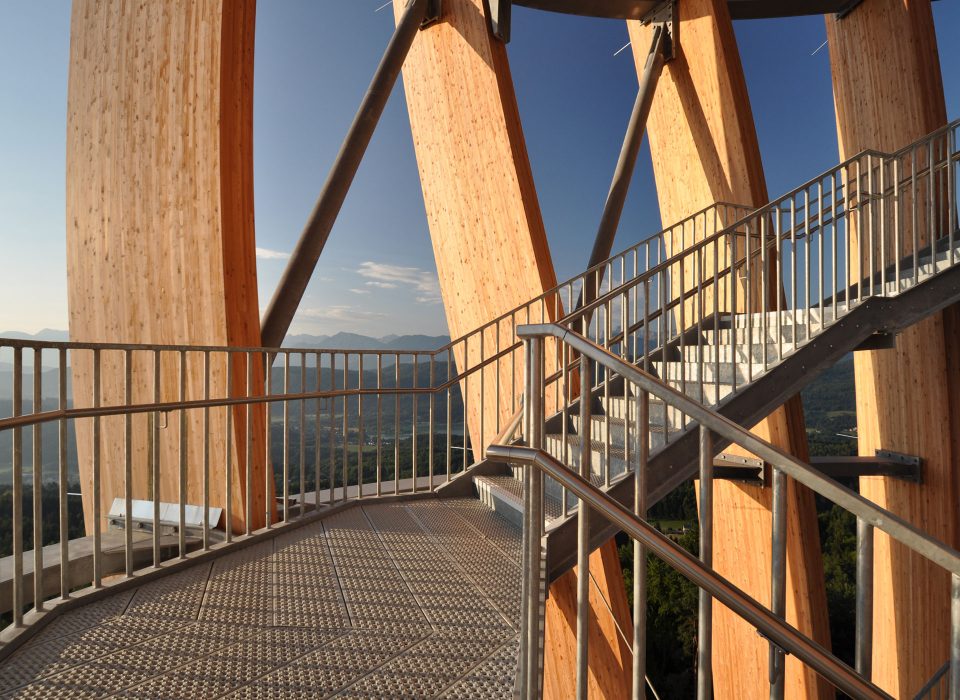 Bis zur Antennenspitze erreicht der Aussichtsturm am Pyramidenkogel eine Gesamthöhe von 100m und ist somit der höchste Holzaussichtsturm der Welt. Die gedrehte Form des Turms entsteht durch zehn Ellipsenringe, welche sich in einem Abstand von 6,40m jeweils um 22,5 Grad versetzt in die Höhe schrauben und gemeinsam mit 80 Stahldiagonalstreben die Aussteifung für die Hauptkonstruktion aus 16 Brettschichtholzstützen aus Lärche bilden. Die Spiralform steht symbolisch für Wachstum und Entwicklung. Angelehnt an einen weiblichen Torso, ausgeführt in heimischer Lärche und Stahl, bildet die Skulptur im Landschaftsraum einen touristischen Anziehungspunkt der besonderen Art. Das Turmbauwerk erstreckt sich über 10 Regelebenen, darüber sind zwei freiliegende Aussichtsplattformen angeordnet. Die Ebene 9 wurde als “SKYBOX“ wetterfest eingehaust. Einen besonderen Kick bietet eine Rutsche, die aus 51,36m Höhe in die Tiefe geht.